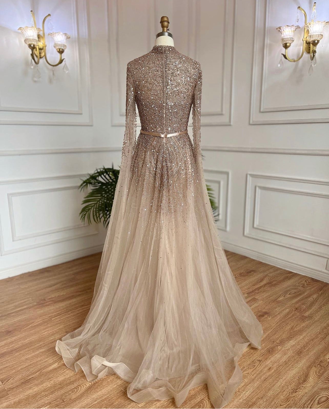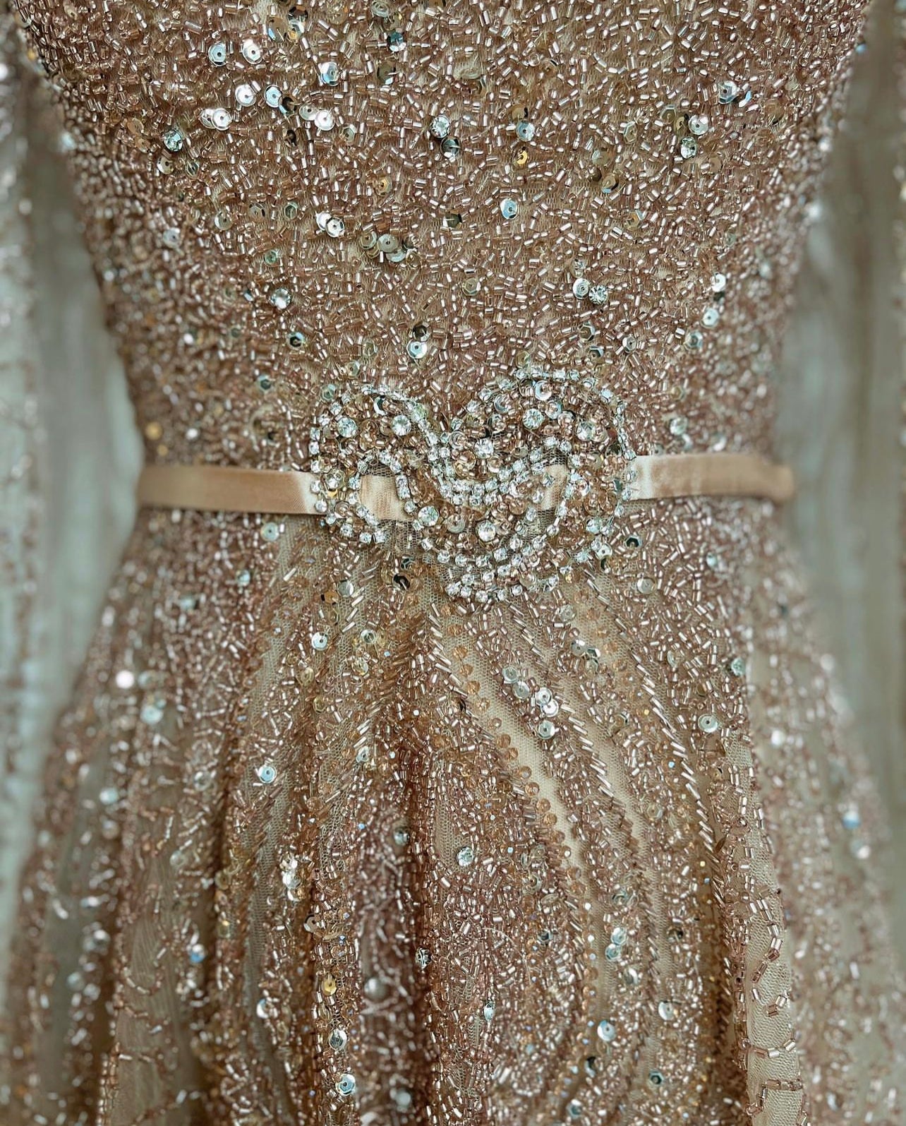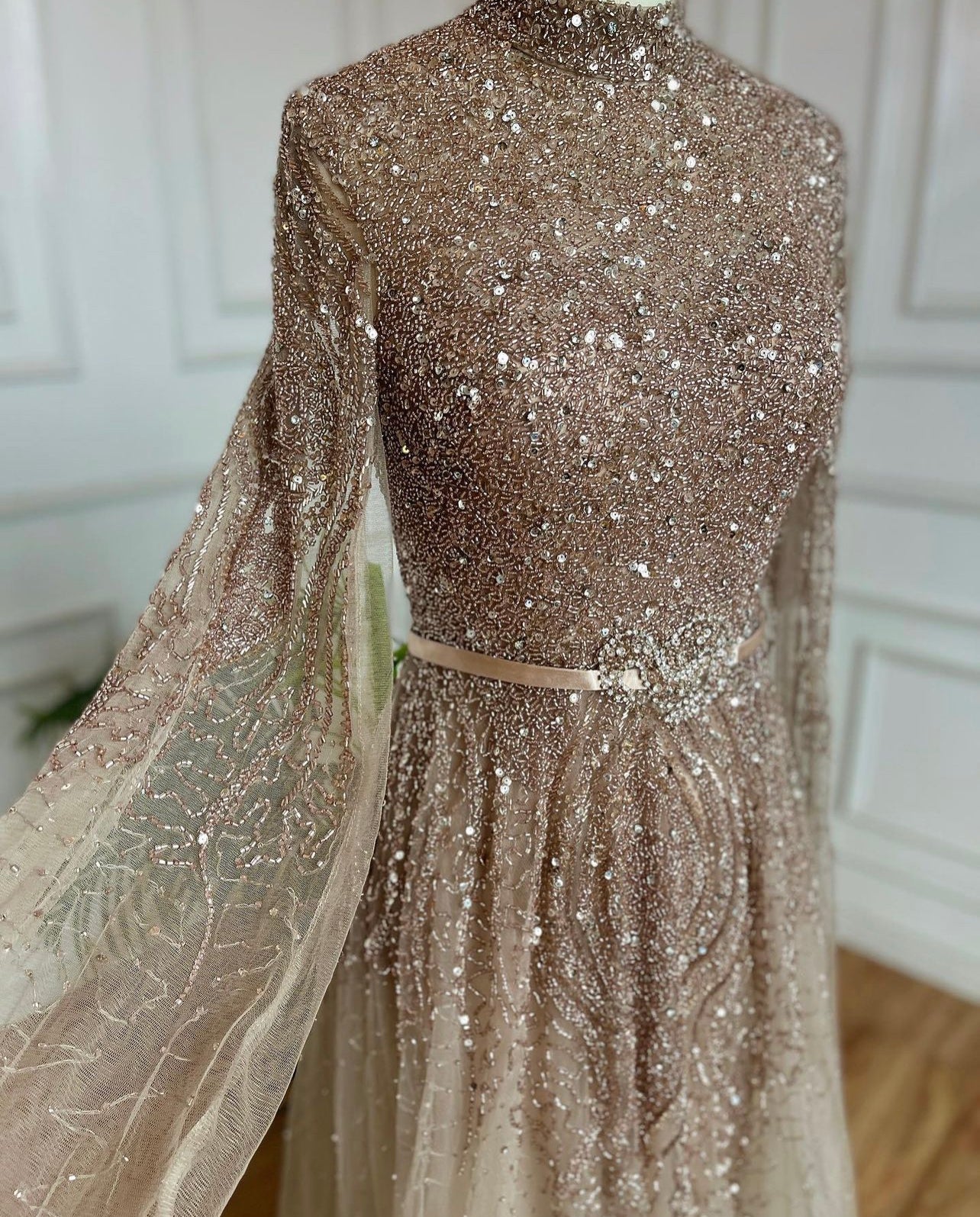 A richly embellished golden gown with a high neck and an A-line silhouette. It features a dainty satin belt around the waist with a center piece to compliment it. The dress also has beautiful flowy cape sleeves that run down the whole length of it to the hem.