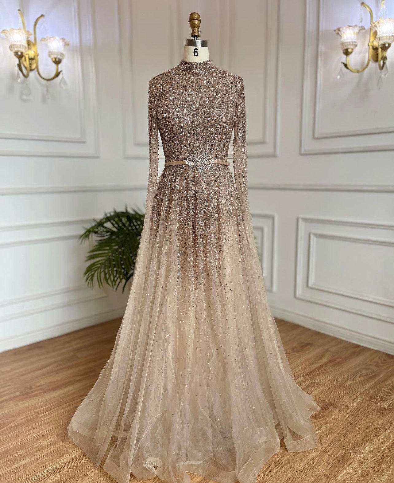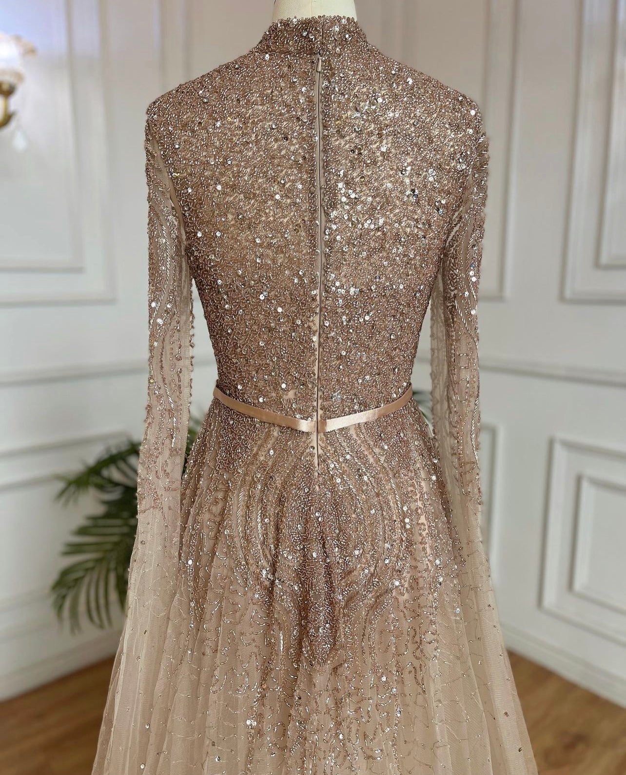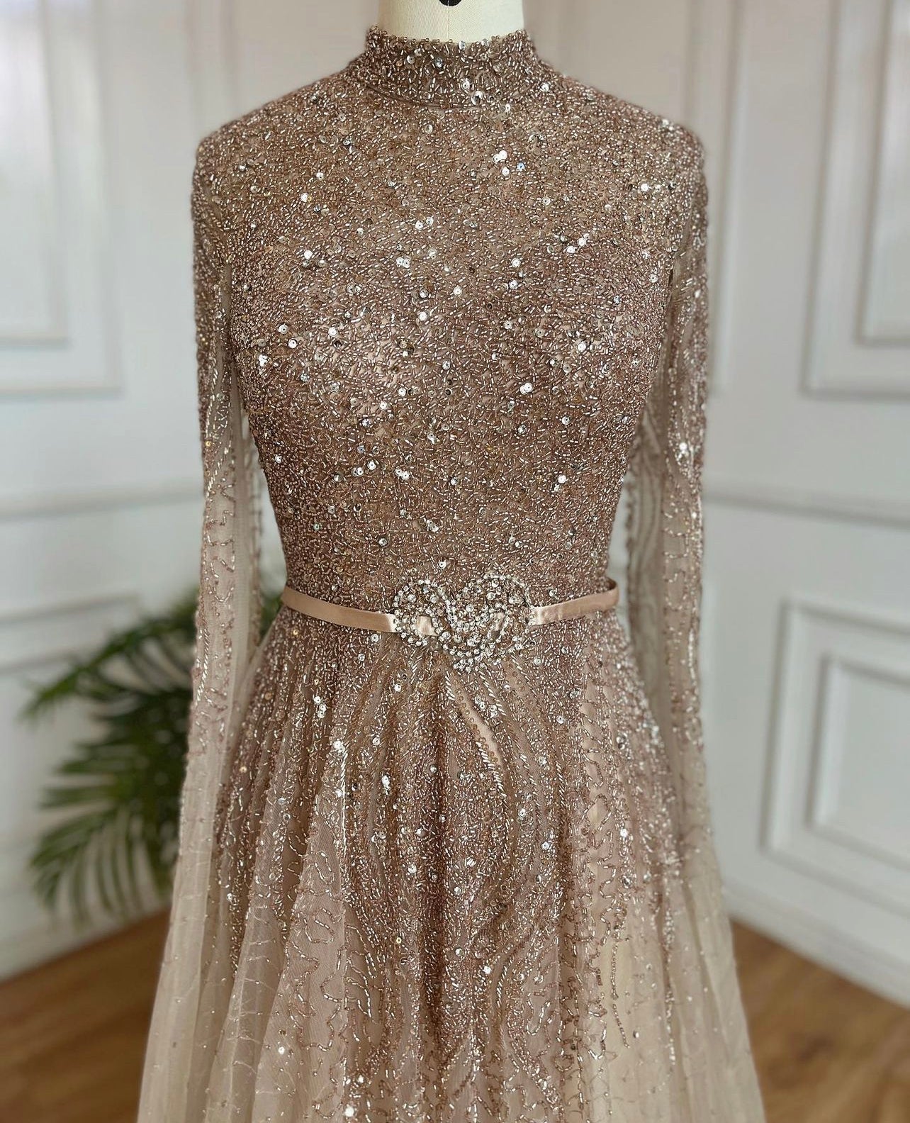 A richly embellished golden gown with a high neck and an A-line silhouette. It features a dainty satin belt around the waist with a center piece to compliment it. The dress also has beautiful flowy cape sleeves that run down the whole length of it to the hem.