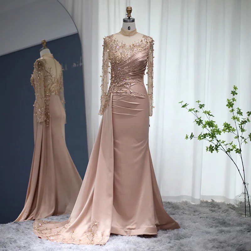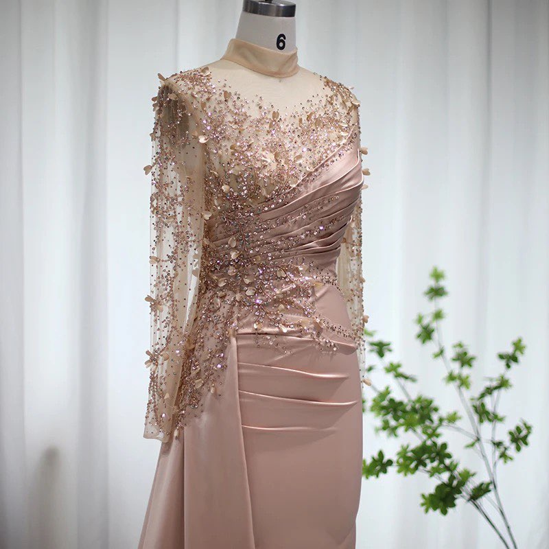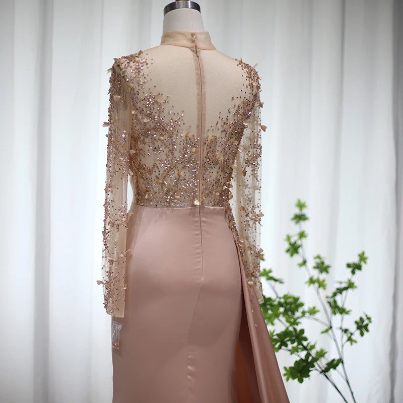 An elegant form fitting satin dress that has a netted high neck. Details on this dress are breathtaking with a combination of sequins and beading starting from the neckline and going down to the hipline. The dress also features a beautiful side skirt with beadwork at the end.