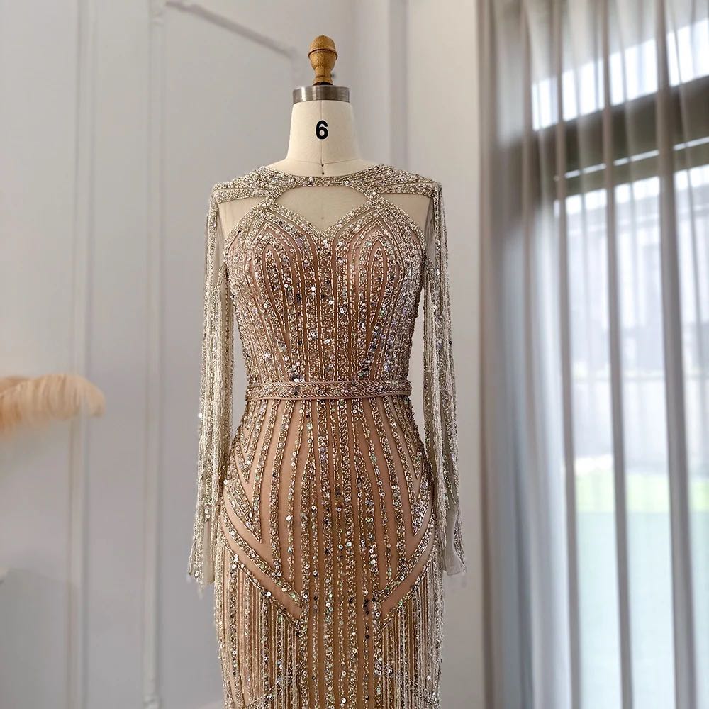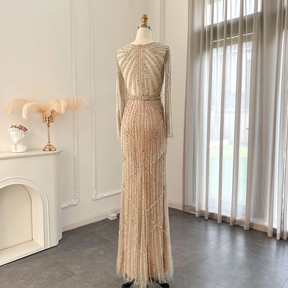 A gorgeous form fitting dress with heavy linear beading throughout the whole dress. It features long sleeves with geometric cut outs on the back and upper chest area. This classy dress is also decorated with loose beaded tassels from the hip down and on the sleeves.