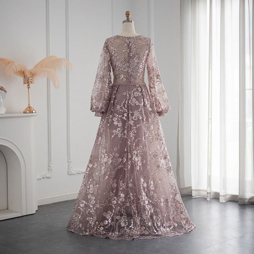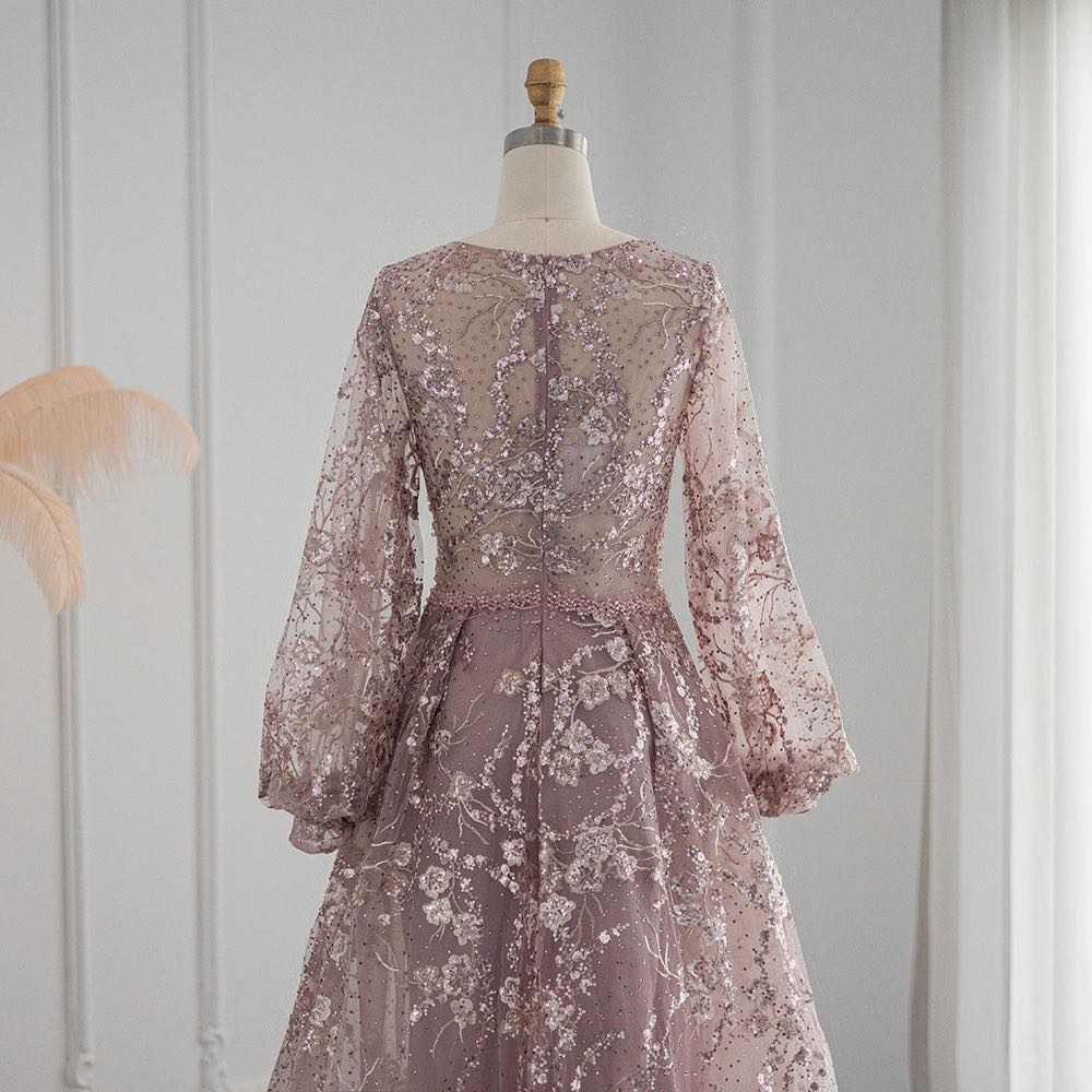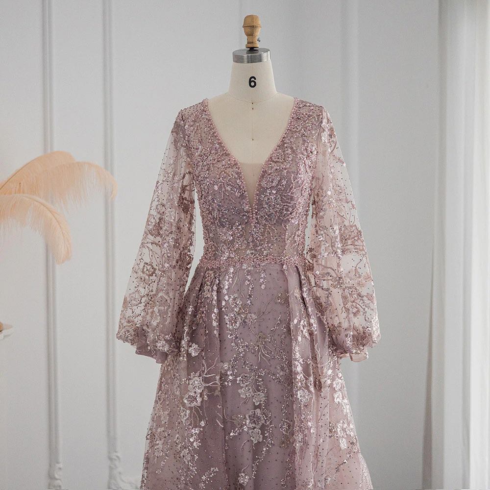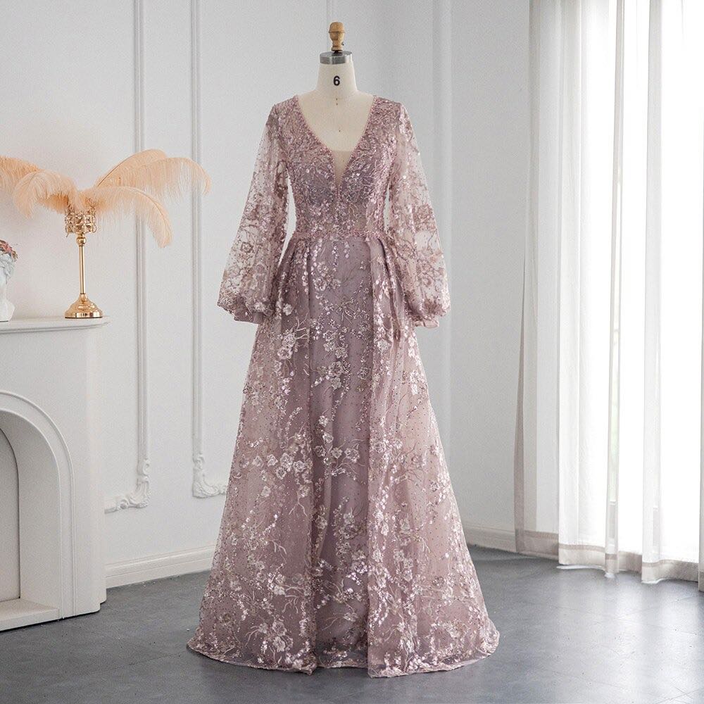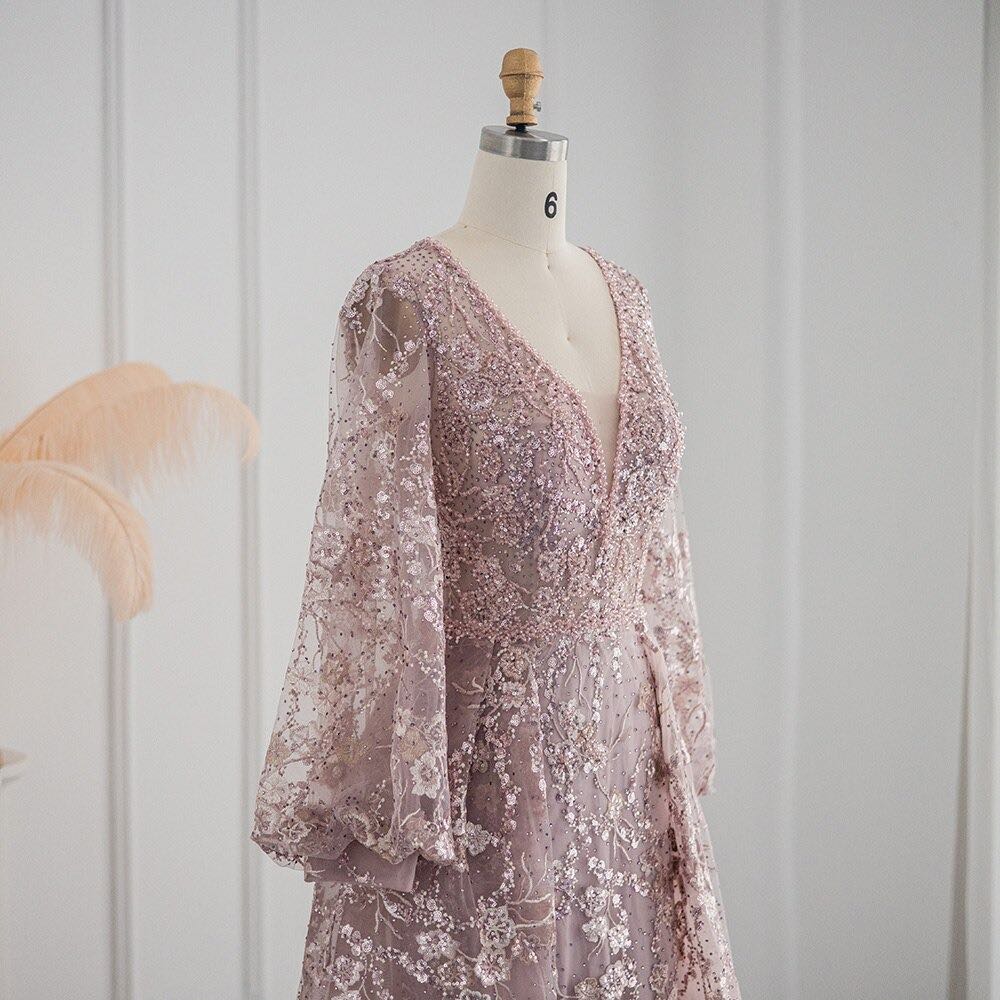 A dusty pink dress with floral embroidery and beading from top to bottom. The dress has an overskirt that is complimented by a delicate row of pink beads around the waist. It also has a low V-neck that is slightly covered by netting for some coverage and beautiful classic balloon sleeves.